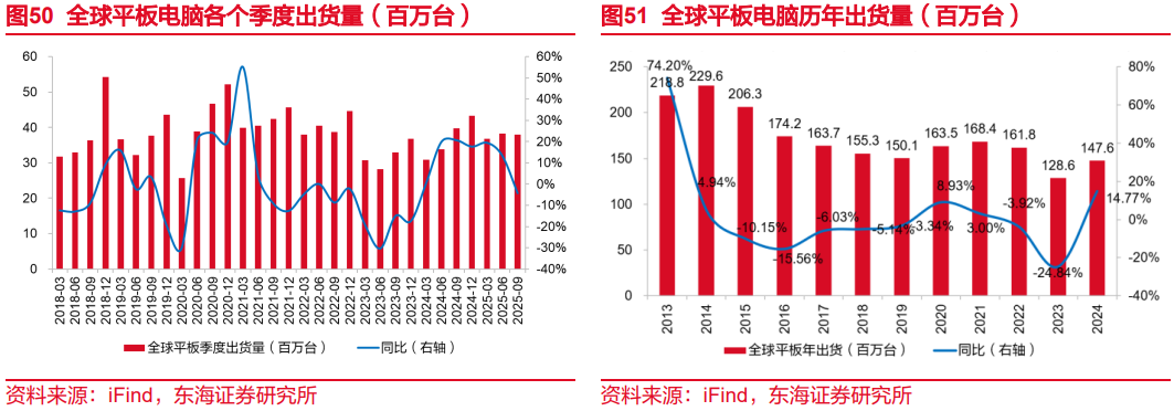 (2)2025Q3全球平板增速同比为-4.28%,2025年Q1-Q3累计同比为8.44%。如下图所示是全球各个季度与历年的平板出货量数据,短期来看,平板电脑的消费量呈现高速增长趋势。长期来看,在2014年全球的出货量高达2.3亿台后,出货量逐年下滑,2023年创下了近10年新低,达到1.29亿台。我们认为,2019-2022年全球出货量维持在1.5-1.6亿台的饱和值,这个是全球历年正常经济发展水平的长期需求量。2021与2022年由于在线办公需求增长,消费量提前增加,因此2023年需求量受到较大冲击。2024年随着全球经济逐步企稳,全球消费水平逐步回归正常,全球的消费量增速回升至14.77%。2025Q3全球出货量同比下降4.28%,主要由于其他品牌出货量明显萎缩,导致整体市场表现受拖累,展望2025全年,平板市场还将维持温和复苏。