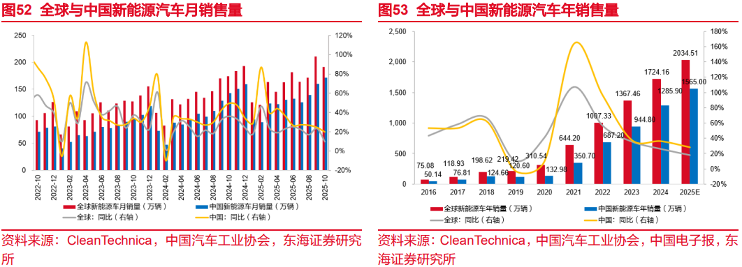 (1)中国新能源汽车销量2025年10月份同比为19.93%,2025年1-10月累计同比为32.41%;全球新能源汽车销量10月份同比为9.75%,2025年1-10月累计同比为21.69%。如下图所示是全球与中国的新能源汽车销量数据,新能源车的单车半导体使用价值量是传统汽车的数倍,新能源汽车的高速增长会带动全球与中国区域的功率、MCU、模拟、CIS、智能驾驶芯片等多种类型芯片的需求增长。2024年中国新能源车销售量占全球的74.58%,我们认为,2025年全球新能源汽车增速有望达到18%左右,中国增速有望达到28%左右,增速高于全球。