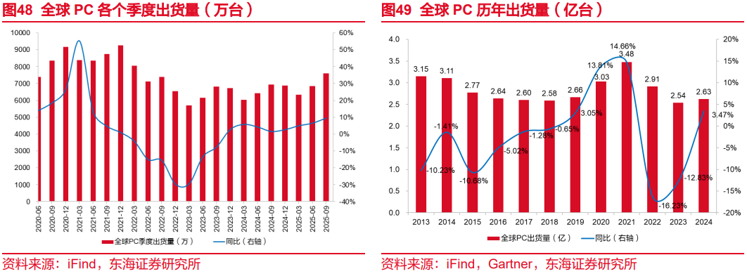 (1)2025Q3全球PC出货量同比为9.52%,2025年Q1-Q3累计同比为7.12%。如下图所示是全球PC市场的季度与年度出货量,短期来看2023Q4开始PC的出货同比增速转正,出货量维持弱复苏趋势;长期看,经过2021年3.48亿台的高峰期后,2022年与2023年呈现快速下滑,主要原因是疫情期间带动了居家办公、在线办公需求,PC需求短期释放。2024年,在经济向好、需求回暖以及AIPC驱动的大环境下,全年全球PC市场出货量同比增长3.47%,相比2023年实现了正增长,2025Q3出货量同比增长9.52%,整体需求有所回温。展望2025全年随着全球经济逐步企稳,全球人均收入长期上升;同时AIPC等创新不断,全球对PC的消费需求或将回归到正常饱和值,2025年全年出货量有望继续实现个位数增长。