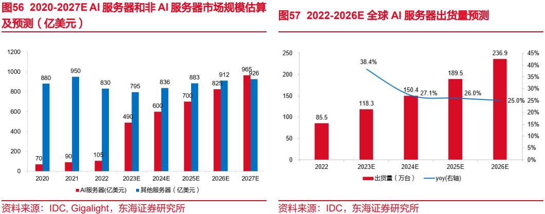 (1)全球AI服务器出货量在未来3年中或将保持25%以上的增速。IDC数据预测,全球AI服务器出货量从2024-2026年或将保持25%以上的增速,由于AI服务器的平均价值量是普通服务器的10倍价格以上,AI服务器的市场规模在2027年或将超过普通服务器的总价值量。AI服务器的主要成本构成中,GPU、DRAM、CPU等占据80%左右成本,先进算力与存储芯片是AI服务器的关键组成,相对来说AI服务器对全球半导体的需求驱动或将更加旺盛。