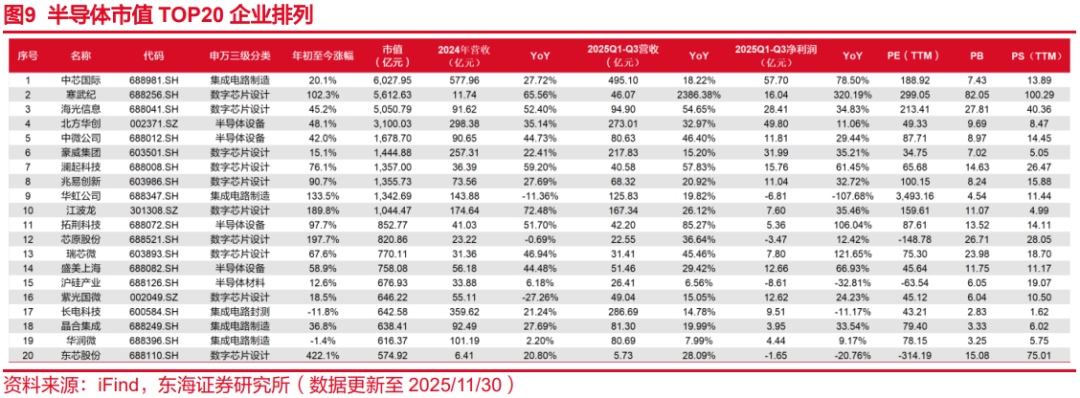(1)根据最新的半导体企业市值排列来看,A股半导体超过1000亿元市值的企业有10家。如下图是申万半导体市值TOP20企业名单排列,其一,相对来说市值较大的企业分布在代工、封测、设备、各个细分板块设计公司,TOP20企业中市值超过1000亿元的有10家,其余企业市值均超过500亿元。其二,半导体企业的营收规模越大整体市值偏大,但有少数营收极小的企业市值也较大,这与企业未来成长空间更加相关。其三,从估值PE、PB来看,市值大小与净利润、净资产的关联性也较弱,可见市场对企业未来的成长空间、技术壁垒、技术先进性等方面的定价更为关键。