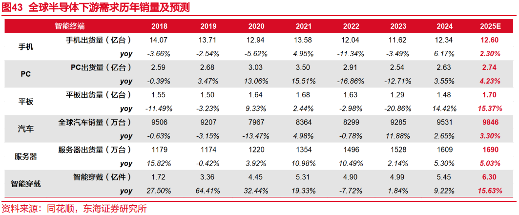 在2024年需求小幅回暖的情况下,预计2025年全球半导体下游需求或将继续维持复苏态势。如下图所示,半导体下游应用主要集中在以下的消费电子产品,经历过2020-2021年的需求高增长后,2022-2023年全球在疫情冲击下需求大幅度回落,2024年整体上有5-15%的需求复苏,预计2025年下游需求会继续回暖,细分赛道看,智能穿戴、智能家居、AI服务器的增速或将更高。