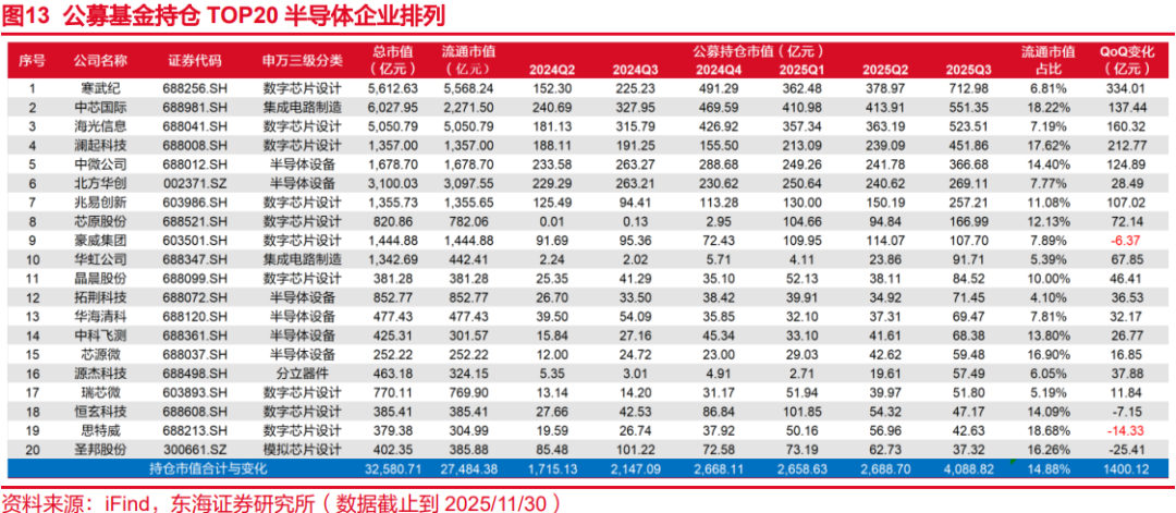 (4)2025Q3公募基金重仓的TOP20半导体个股均为市值在200亿元以上的企业,持仓市值在TOP20企业占据所有持仓半导体市值的比例高达86.51%。根据最新的公募基金持仓数据,我们总结了公募基金持仓半导体个股的金额排行,相对来说公募基金持仓最多的个股多为市值较大的企业,根据公开数据,2025Q3持仓超过100亿元的个股有寒武纪(713亿元)、中芯国际(551亿元)、海光信息(524亿元)、澜起科技(452亿元)、中微公司(367亿元)、北方华创(269亿元)、兆易创新(257亿元)、芯原股份(167亿元)、豪威集团(108亿元)。公募基金持仓市值TOP20的半导体个股合计约为4088.82亿元,占据持仓半导体总市值4726.55亿元的86.51%,说明了公募基金重点配置半导体企业龙头标的。公募基金重仓配置半导体行业,也说明了对我国半导体产业长期发展空间有较高的预期。