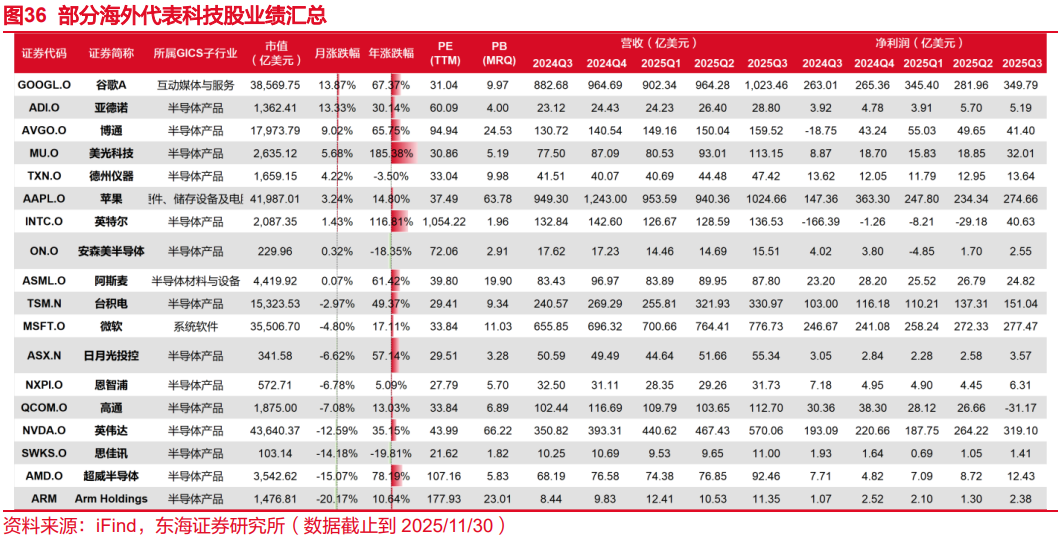 (3)大部分海外头部科技厂商已披露2025Q3业绩,整体表现大多实现了营收和净利润的同比增长,体现了半导体市场需求在逐步好转。11月涨幅居前的为谷歌A(+13.87%)、亚德诺(+13.33%)、博通(+9.02%)。