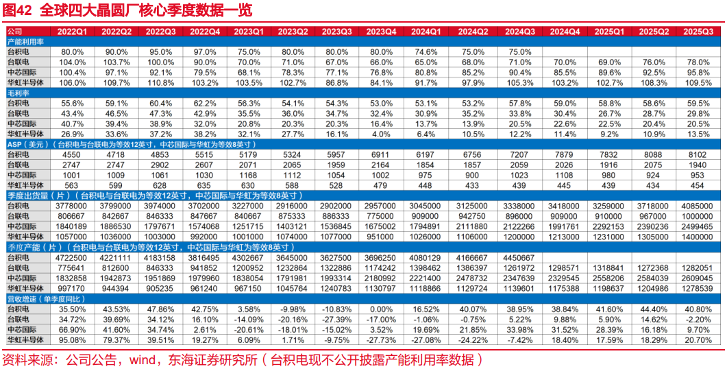 (2)2025Q3晶圆厂的数据显示产能利用率同环比均有所上升,台积电晶圆价格同环比也继续上涨。如下图所示,截至2025年11月6日的台积电与台联电2025Q3数据显示,出货量同环比呈现上涨趋势,说明整体行业需求出现了较大的复苏,供给端有所增长;台积电晶圆价格同环比均上升,除了先进产能的增加导致的单价增长因素外,行业需求有所回暖或也带动价格上涨。