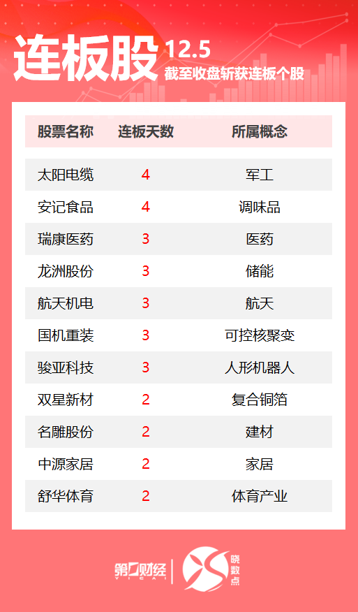 12月5日,Wind数据显示,A股市场共计80只个股涨停。其中军工板块太阳电缆收获4连板,可控核聚变概念股国机重装3连板。一图速览今日连板股>>