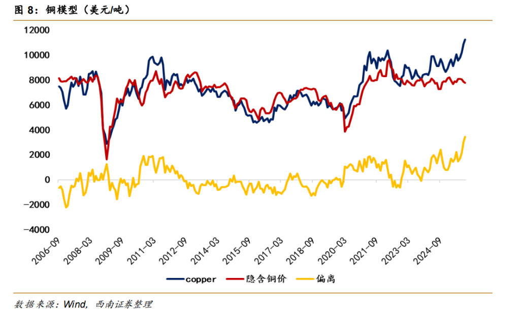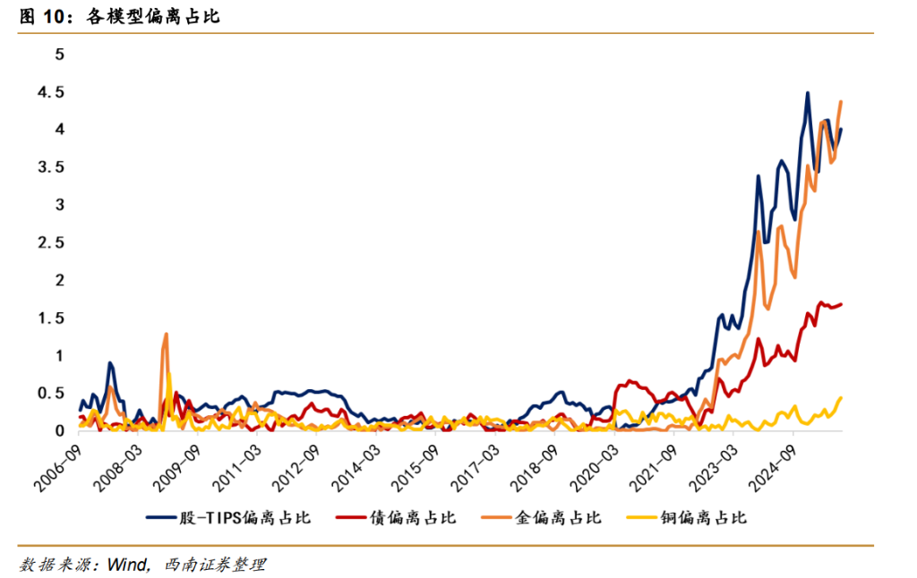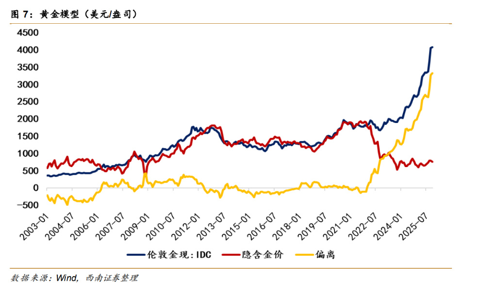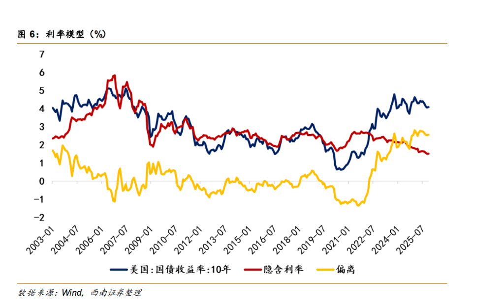 西南证券将利率拆解为黄金(隐含TIPS)和铜(隐含通胀预期)的函数,发现一个惊人的缺口。
