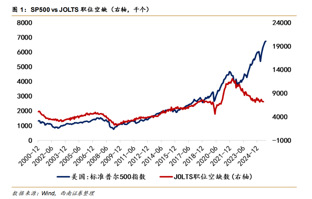 1.美股与经济脱钩: 标普500指数在职位空缺(JOLTS)持续下滑的背景下不断创新高,市场对衰退信号已经脱敏。
