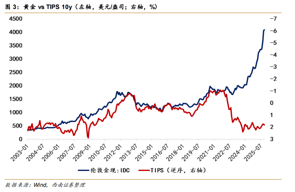2.黄金与利率脱钩: 黄金完全无视高实际利率的压制,走出了甚至与TIPS(通胀保值债券)背离的独立行情。