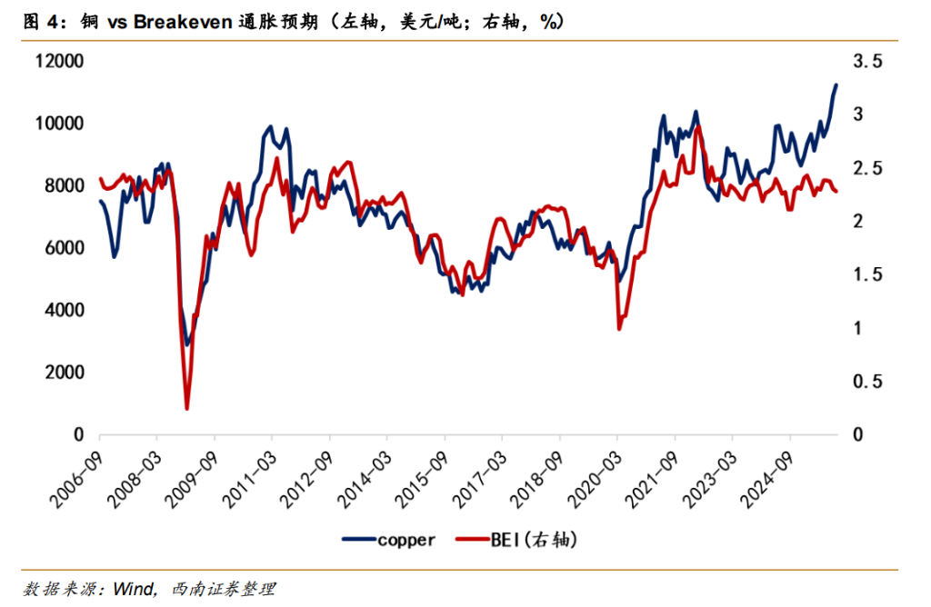 3.铜与通胀脱钩: 作为通胀预期的代理变量,铜价的走势也不再紧贴传统的通胀逻辑。
