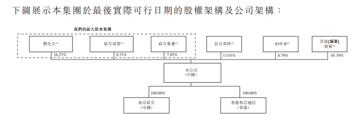 IPO前,董事长兼总经理刘石直接持有16.23%,砹亘成智直接持有8.71%;及砹亘集荟直接持有7.85%。刘石是砹亘成智、砹亘集荟的普通合伙人,合计控制移芯通信32.79%的表决权。