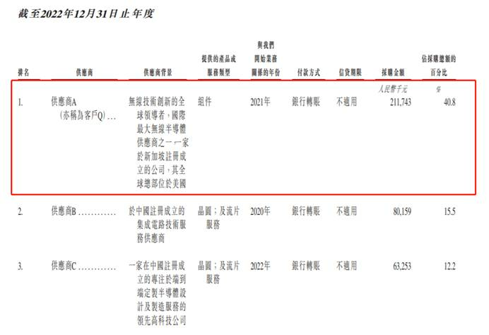 2022年,供应商A(亦称为客户Q)的采购金额为2.12亿元,占采购总额的40.8%。后于2023年、2024年及2025年上半年并无向客户Q作出任何采购。