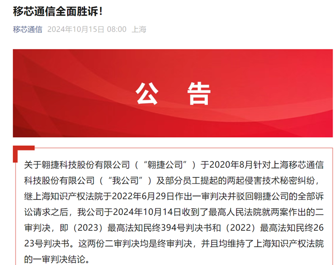 同年10月,移芯通信在其官微宣布全面胜诉。