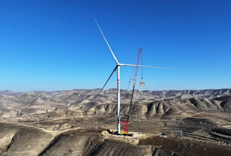 12月3日,龙源电力宁夏腾格里“沙戈荒”新能源基地海原100万千瓦风电项目顺利完成首台风机吊装,标志着宁夏单体容量最大风电项目全面转入设备安装关键阶段。
