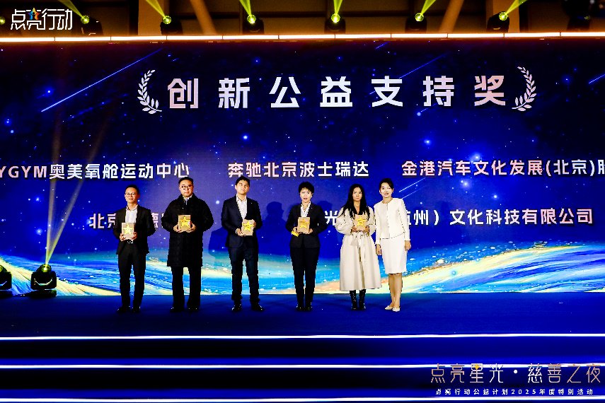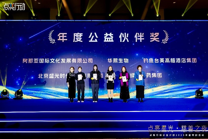 一路走来,点亮行动收获了社会各界的关注与支持,当晚活动也将这份敬意与谢意,化为沉甸甸的荣誉。现场将“年度公益伙伴奖”授予阿那亚国际文化发展有限公司、华熙生物、钓鱼台美高梅酒店集团、北京盛光时代广告有限公司、绿叶制药集团,感谢其长期以来提供的温暖陪伴与支持;将“创新公益支持奖”授予奥美氧舱运动中心、奔驰北京波士瑞达、金港汽车文化发展(北京)股份有限公司、北京怡德医院、与光同尘(杭州)文化科技有限公司,感谢其以跨界创新力量,拓宽公益的边界;将“公益空间贡献奖”授予海南蓝星河自然教育基地、燕京书画社、国家河北承德塞罕坝体育训练基地,感谢其提供的宝贵空间,让星光点亮更多角落。长期对点亮行动提供大力支持的华熙生物集团代表——华熙生物集团、北京时代美术馆执行馆长刘威威也上台作为“老朋友”,分享了与点亮行动并肩同行的感悟。长期为点亮行动提供公益传播支持的经观传媒,也作为媒体代表来到现场,见证了当晚的荣耀时刻。这些奖项不仅是对所有星光爱心企业卓越贡献的肯定,更是凝聚未来合力的号角。