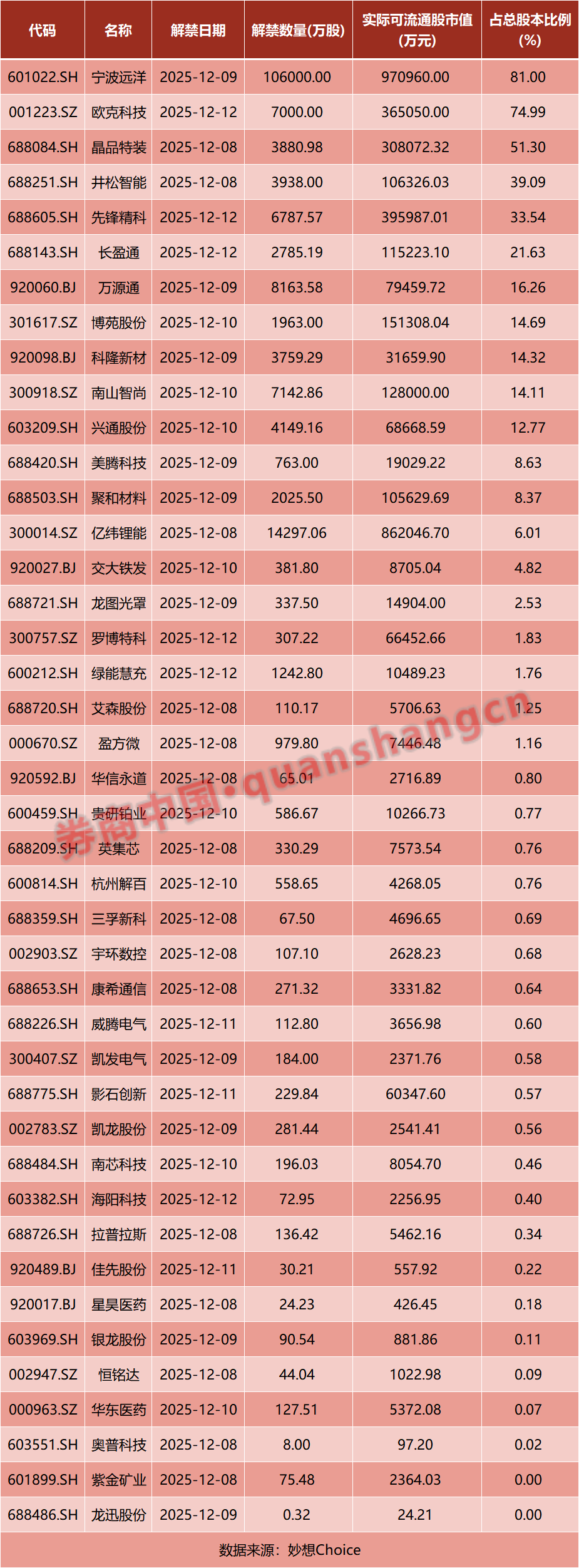 数据显示,本周(12月8日—12月12日)共有42家公司限售股陆续解禁,合计解禁17.96亿股,按最新收盘价计算,解禁总市值为395.2亿元。