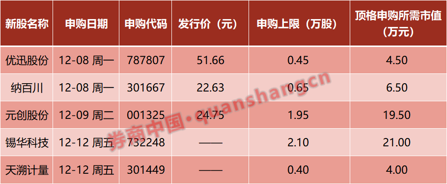 本周(12月8日—12月12日)有5只新股发行。周一:优迅股份、纳百川;周二:元创股份;周五:锡华科技、天溯计量。