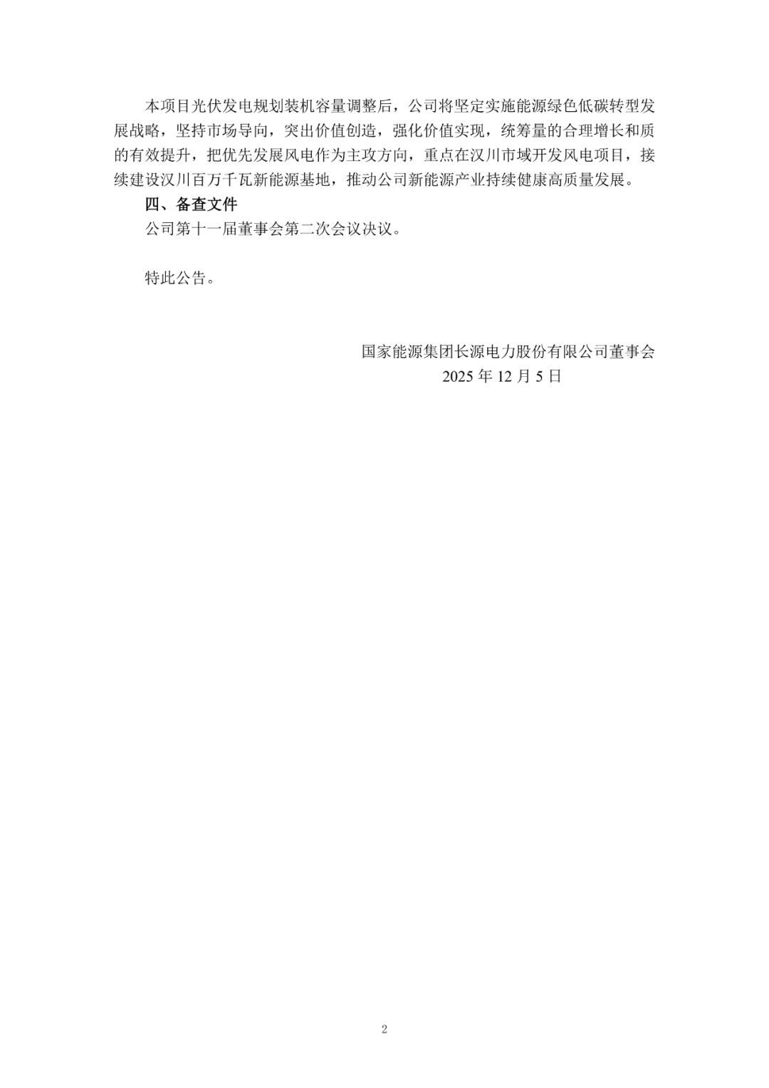 12月5日,国家能源集团长源电力股份有限公司发布《关于国能长源汉川市新能源百万千瓦基地二期项目进展情况的公告》、《关于国能长源汉川市新能源百万千瓦基地三期项目进展情况的公告》、《关于国能长源荆门市源网荷储百万千瓦新能源基地钟祥子项目进展情况的公告》。