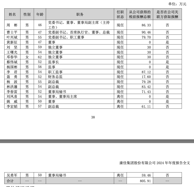 2024年年报显示,公司董事、监事和高级管理人员2024年报酬总额805.91万元。党委书记、董事、董事局副主席(主持工作)周彬2024年从公司获得的税前报酬总额为86.33万元。党委副书记、首席执行官、董事、总裁曹士平2024年从公司获得的税前报酬总额为90.46万元,董事会秘书李春雷2024年从公司获得的税前报酬总额为71.43万元,以上人员均未在公司关联方获取报酬。