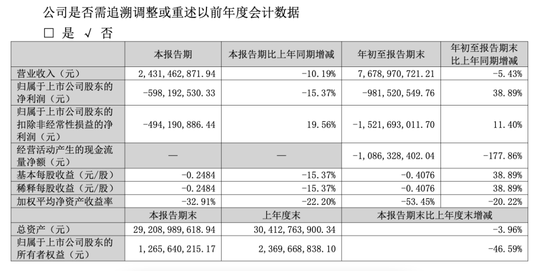 深康佳A(000016)发布2025年三季度报,今年前三季度,公司实现营收76.79亿元,同比下降5.43%;归属于上市公司股东的净利润-9.82亿元,亏损收窄。其中,第三季度营收为24.31亿元,同比下降10.19%;归属于上市公司股东的净利润-5.98亿元,亏损扩大。