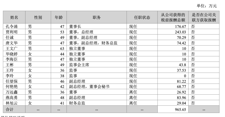 2024年年报显示,公司董事、监事和高级管理人员2024年报酬总额965.65万元。董事长孔令涌2024年从公司获得的税前报酬总额为176.67万元。董事、总经理贾利明2024年从公司获得的税前报酬总额为243.03万元,副总经理、董事会秘书何艳艳2024年从公司获得的税前报酬总额为68.77万元,以上人员均未在公司关联方获取报酬。