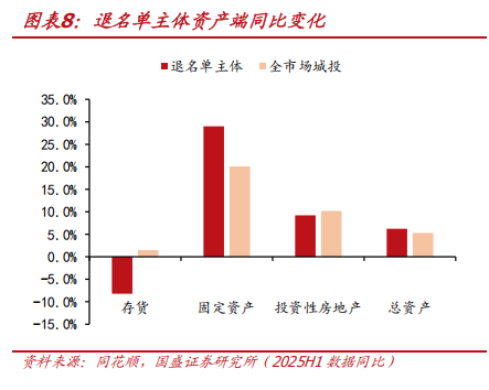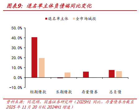 以2025年中期财务数据来看,资产端:全市场总量变化不大,结构分化明显。存货规模较去年同期仅微增1.5%,而退名单主体甚至下降了8.2%。城投企业的存货科目往往包含土地和在建项目等。推测一揽子化债下,城投企业新增项目投资由过去粗放型转为更加审慎。固定资产同比大幅增长近30%,大概率对应着地方政府将水务、物业、文旅、停车场等能够产生稳定现金流的经营性资产注入,旨在直接增强平台的造血能力,为其后续进一步市场化转型奠定基础。负债端:退名单主体短期借款同比大幅增长40.6%,远高于全市场城投19.6%的增幅。但长期借款增长整体乏力,出现了1%的微降。对于城建类主体来说,长期借款所形成的长期债务往往对应着项目建设投入。一方面在“防风险、保兑付”的化债基调下,新增项目投资明显审慎;另一方面,区县级平台融资功能上收也加剧这一趋势,更多新建项目由市级主体统筹实施,一定程度上削弱了区县级平台长期融资需求。加上“开正门、堵偏门”的政策导向下,更多重大项目转而通过专项债渠道融资,在一定程度上替代了银行中长期贷款。