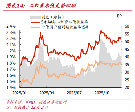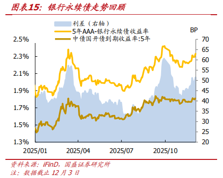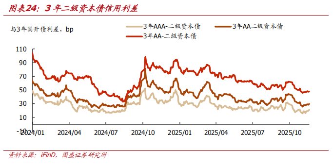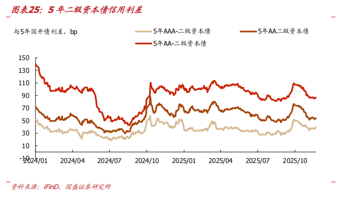 明年供需格局下,预计二永债收益率将继续下行,交易盘关注二永的波动交易机会,配置盘逢调整参与。明年信贷需求偏弱趋势或延续,发行特别国债后国有行资本充足率较高,参考二永债剩余批复额度和明年到期规模,预计明年二永债净融资或将维持低位。虽然今年公募基金费率改革、增值税费率调整对二永债估值造成阶段性影响,但考虑到明年供需格局,二永收益率或将继续下行,低利率环境下,以基金为主的非法人主体将是二永债的主要需求力量,票息有限,波段交易为主,而保险、银行等配置盘的需求或有限,更多关注市场调整后的配置机会。