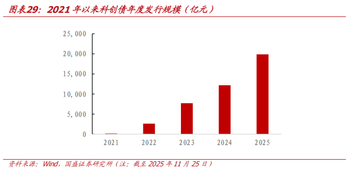 2021年科创公司债开始试点后,发行规模持续增长。截至2025年11月25日,科创公司债和科创票据历史累计发行额达到4.25万亿元,其中2025年已累计发行1.99万亿元,远超过2024年发行额1.22万亿元。