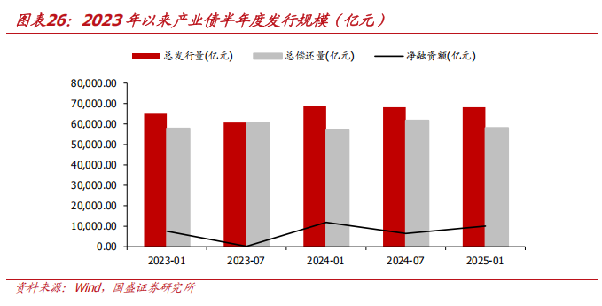 产业债自2024年以来净融资表现突出,是信用债市场的主要增量。2023年下半年净融资仅为164.13亿元,2024年起净融资增加,半年的净融资维持在万亿左右。