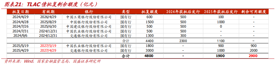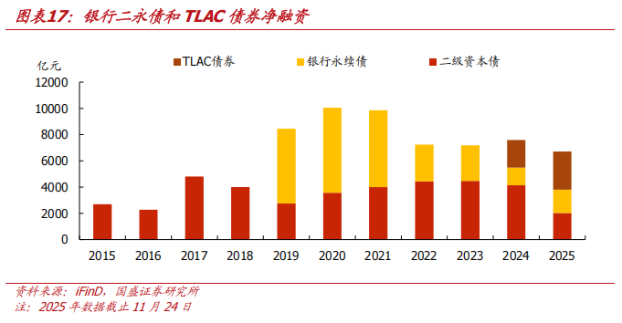 预计明年TLAC债发行规模在3000亿元左右,对二永净融资形成一定补充。2024年国有大行TLAC债批复已全部发行完毕或失效,截至11月24日,2025年TLAC债剩余可用额度为2900亿元。2024年、2025年(截至11月24日)发行TLAC债券分别为2100亿元、2900亿元,结合TLAC监管指标情况、第二阶段监管时点,预计明年TLAC债供给相对平稳,可能在3000亿元左右。