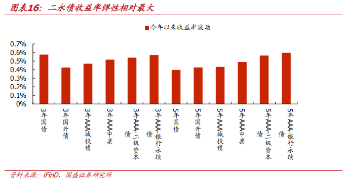 相较于同期限信用债来说,二永债仍然是弹性最大的券种。以今年以来至11月21日收益率变动幅度(最大值与最小值之差)来看,3年国债、国开债、AAA城投债、AAA中票、AAA-二级资本债、银行永续债收益率变动幅度分别为0.57%、0.42%、0.47%、0.52%、0.54%、0.57%;5年国债、国开债、AAA城投债、AAA中票、AAA-二级资本债、银行永续债收益率变动幅度分别为0.40%、0.43%、0.43%、0.49%、0.56%、0.60%。