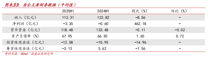 通过观察尚未违约的235家发债房地产开发企业的主要财务数据,整体反映出上半年房地产企业经营压力进一步加剧、现金流与盈利状况恶化的情况。2025年上半年行业实现收入平均值为112.31亿元,同比下滑8.56%;债务压力上升,资产负债率同比上升1.65个百分点;现金流与资金链趋紧,货币资金同比减少0.11%,环比减少0.02%。