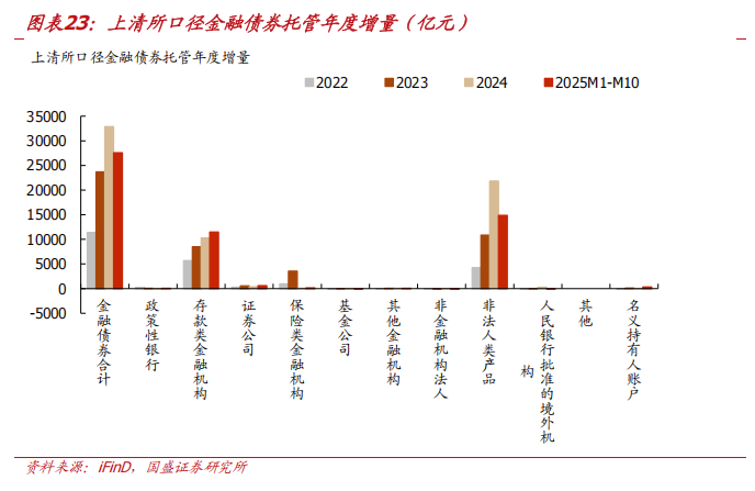 今年存款类金融机构是金融债最主要的需求力量,非法人类产品增持规模较去年明显下滑。理财规模和产品结构影响理财配债规模和配债券种偏好,负债端偏短决定了理财偏好配置短债。基金等非法人类产品今年前十月增持5910亿元,相较去年全年11825亿元的增量(上清所+中债登)明显下滑,年内基金负债端承压,为稳净值与应对赎回,机构更偏好利率债、存单等高流动性资产,降低对商业银行债等金融债的配置需求。而存款类金融机构今年前十月净增持9455亿元金融债,相较去年6350亿元明显增加,在信贷弱的环境下,银行仍有较高的配债诉求,今年政府债供给规模大,面对利率风险、流动性风险等监管约束,利用金融债票息略优、流动性尚可的特点,银行在资产组合中多配金融债。