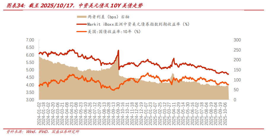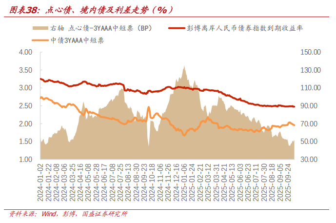 点心债的基准利率是离岸人民币主权债。今年点心债的表现优于境内债,点心债与境内中短票的收益率差距缩小,境内外市场的定价逻辑趋于同步,主要与境内信用债票息较低、以及“南向通”等政策便利化、资本流动顺畅有关,截至2025/10/17,仍有50bp左右的利差。