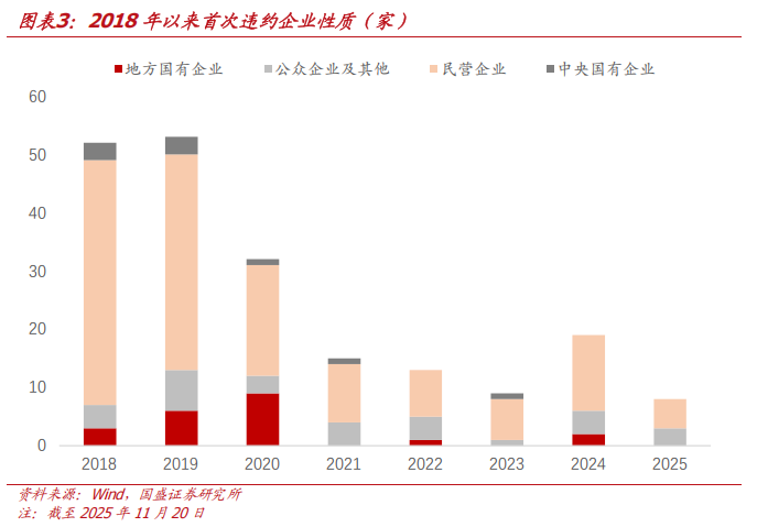 2025年首次违约数量进一步下降,且无国央企发生首次违约。境内信用债市首次违约企业仅8家,较2024年19家大幅下降。其中民营企业5家,公众企业及其他3家。