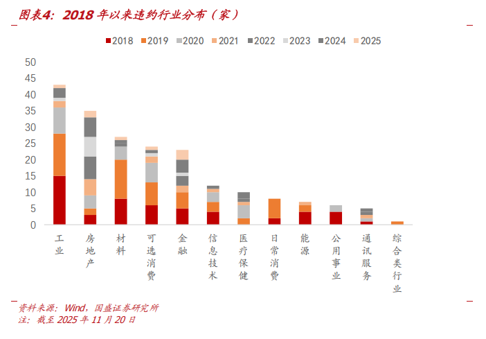 行业分布来看,近些年地产、工业是违约“重灾区”,2025年的违约主要分布在金融(3家)、地产(2家),整体相较之前年度各行业违约规模均处于较低水平。