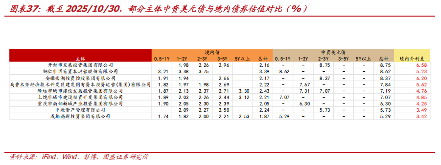 从信用角度,永煤之后的产业债市场地方国企和央企出现违约或展期的情况明显减少,各地对于风险事件造成的负面连锁反应都更加重视,偿债意愿较强,今年国务院总理李强在政府工作报告中提出,有效防范化解重点领域风险,牢牢守住不发生系统性风险底线,中资美元债的投资思路仍可从境内外利差寻找央国企债券的投资机会,下表列示了部分美元债估值5%以上,且境内外利差较高的主体,投资者可根据自身的风险偏好进行配置。