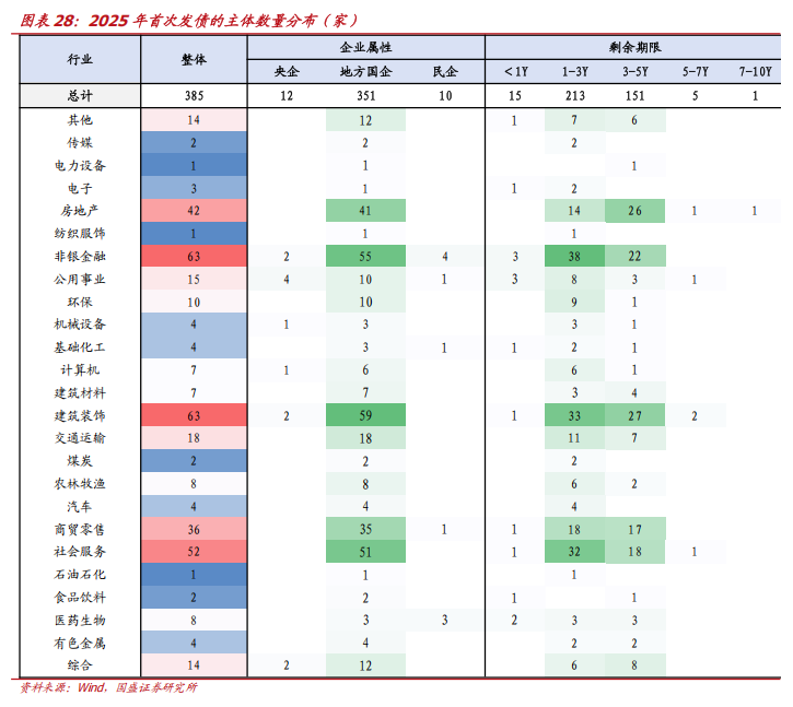 其中,从首次发债来看,2025年首次发债的主体涉及房地产、非银金融、建筑装饰、商贸零售、社会服务等多个领域,其中非银金融(63家)、建筑装饰(63家)、社会服务(52家)、房地产(42家)等行业的发债规模相对突出;从企业属性看,以地方国企为主,同时涵盖央企、民企等,例如房地产领域以地方国企为主,非银金融、建筑装饰等行业也以地方国企为主要发债主体;从剩余期限角度,目前首次发债的存量债券多为1-3年期,占比高达55.32%。