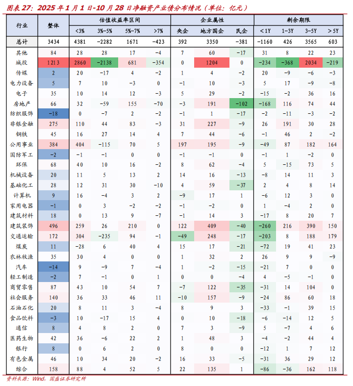 2025年1-10月净融资在行业、企业属性和剩余期限上分化明显。整体来看,地方国企净融资规模占比较大,而民企为净融资负增长;分行业看,城投、建筑装饰、公用事业等行业净融资表现亮眼,纺织服饰、汽车等行业则净融资为负;剩余期限上,3-5Y区间的净融资规模相对突出,达到3565亿元。这种分化体现了不同行业、企业属性的融资能力和市场偏好差异。