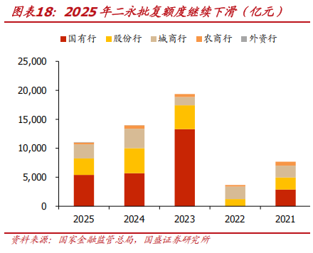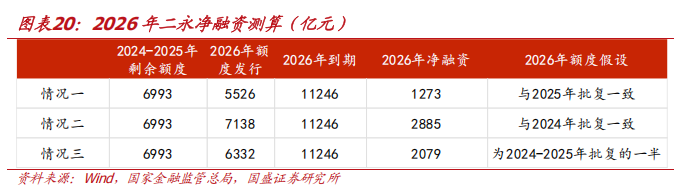今年二永批复额度继续下滑,预计明年二永净融资维持低位,资产荒压力将持续。二永债发行额来自于往年批复剩余额度+当年新批复额度使用部分,二永获得批复后通常需要在2年内完成发行,2024年和2025年二永批复额度,目前剩余未使用额度为6993亿元,假设全部在2026年发行完毕。考虑到特别国债对大行资本的补充、信贷需求偏弱,预计明年二永批复额度将平稳偏低,假设2026年批复规模有三种情况,与2024年一致、与2025年一致、为2024年和2025年的平均值,获批后当年发行50%。明年二永净融资到期11246亿元,则三种情景分别对应净融资为1273亿元、2885亿元、2079亿元。二永净融资将进一步下降,资产荒压力将加剧。由于中小银行资本补充渠道较为单一,且资本充足率相对较低,可能存在一定补充资本的增量需求,结合过去两年城农商批复的变化,假设这部分增量在1000亿元,预计明年二永净融资规模在2000-4000亿元,二永净融资或维持低位。