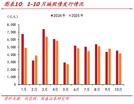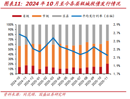 2025年1-10月,城投债累计发行4.7万亿元,总发行规模较去年同期下降7%;除2月和9月外,其余月份均为负增长。城投债发行层级中枢逐渐上移,区县级城投在总发行量中的占比显著下降。即化债与“退名单”的压力最先作用于低层级城投,退出名单后可能不再承担发债职能。而省级和市级城投占比震荡上行,特别是今年下半年以来更加明显。一方面是更多地方的城投发债权限被逐步上收,另一方面在信用分化加剧的环境下,投资者的风险偏好更趋谨慎,资金进一步向高层级、高资质主体集中,通过信用资质“下沉”博取收益的策略性价比已显著降低。