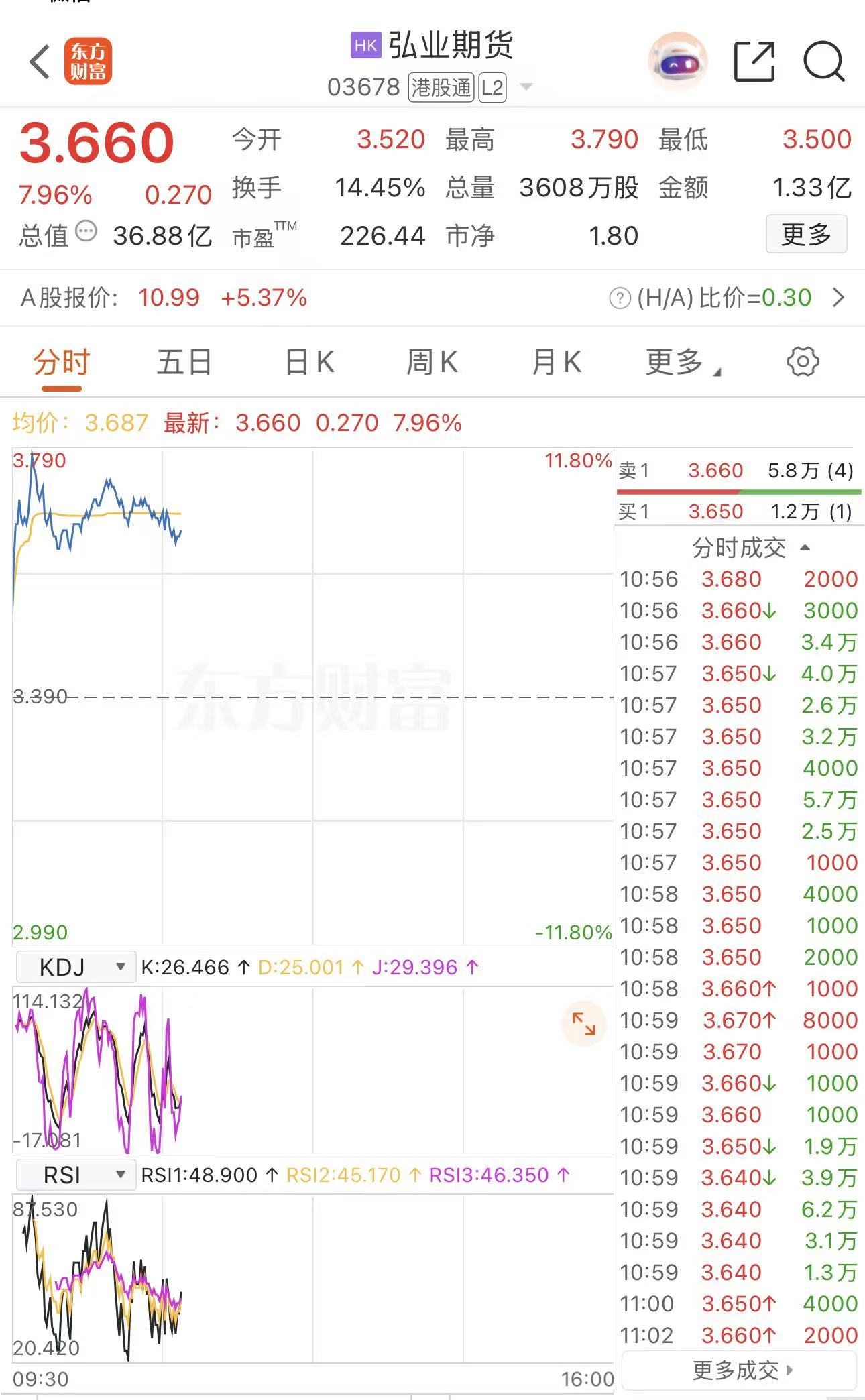 上证报中国证券网讯(记者 唐燕飞)12月8日,港股券商期货股涨幅居前。截至11时02分,弘业期货涨7.96%,盘中一度涨11.8%。华泰证券涨7.24%,国泰海通涨5.97%。