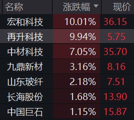 上证报中国证券网讯(记者 于祥明)12月8日,A股玻璃纤维概念保持活跃,截至13时42分,宏和科技、再升科技涨停,中材科技、九鼎新材、山东玻纤、长海股份、中国巨石等个股跟涨。