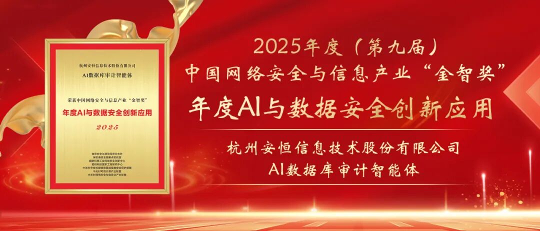 在近日揭晓的2025年度第九届中国网络安全与信息产业“金智奖”(以下简称“金智奖”)评选中,杭州安恒信息技术股份有限公司(以下简称“安恒信息”)成为焦点。公司凭借前瞻布局与技术深耕,其“人工智能全域安全解决方案”荣获“年度创新解决方案”,同时,其“AI数据库审计智能体”摘得“年度AI与数据安全创新应用”奖项,实现了在AI安全领域的双重认可。
