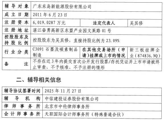 广东东岛与中信建于11月27日签署辅导协议,据悉参与辅导工作的证券服务机构还包括北京市中伦律师事务所、天职国际会计师事务所(特殊普通合伙)。