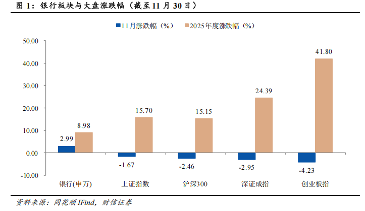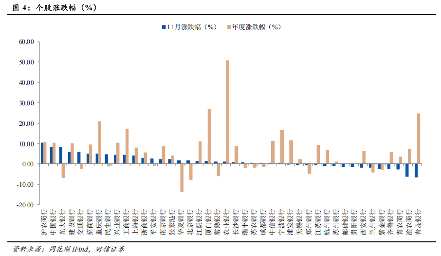 11月,申万银行录得涨跌幅2.99%,跑赢上证指数4.66pp,跑赢沪深300指数5.44pp,月涨跌幅在申万31个一级行业中排名第2位。