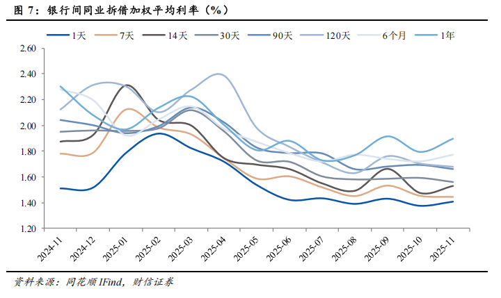 同业拆借利率下降。11月份,同业拆借加权平均利率为1.42%,环比下降6BP,同比下降20BP。环比来看,除30天、90天、9个月期利率上升外,其余期限均下降,其中14天期利率降幅最大,降幅为19BP。同比来看,所有期限利率均下降,其中14天、60天、120天期限利率同比降幅最大,均下降0.45pp。