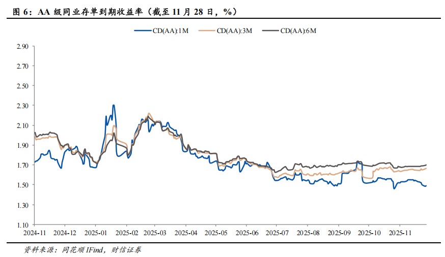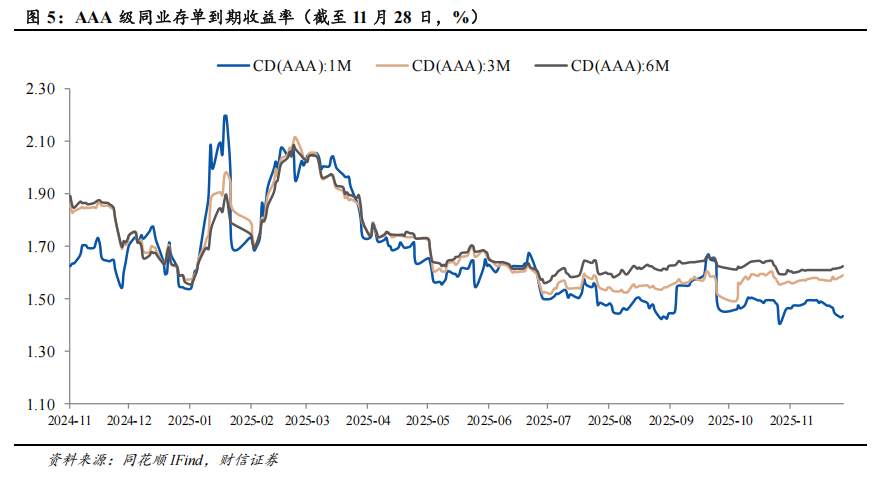 同业存单到期收益率上升。AAA级1M/3M/6M同业存单到期收益率分别为1.45%、1.58%、1.62%,较10月末分别上升4BP/2BP/2BP。AA级1M/3M/6M同业存单到期收益率分别为1.50%、1.65%、1.69%,较10月末分别上升4BP/2BP/2BP。AAA级3M-1M同业存单利差为13BP,较10月末利差下降2BP;AA级3M-1M同业存单利差为15BP,较10月末利差下降2BP;AA级-AAA级3M同业存单利差为8BP,较10月末持平。