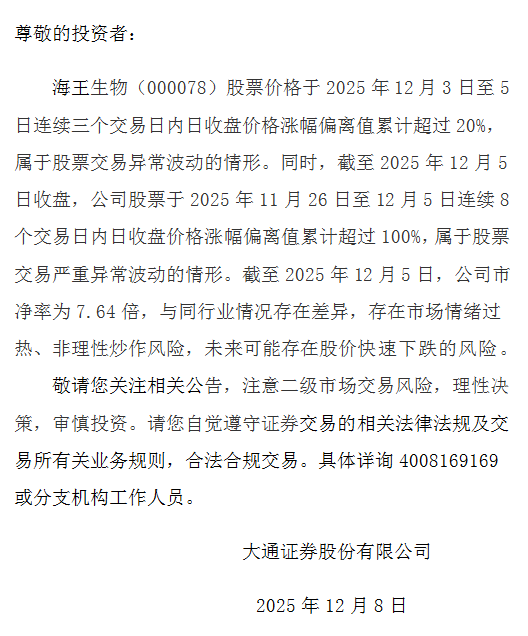 【风险提示】关于海王生物(000078)交易风险提示公告