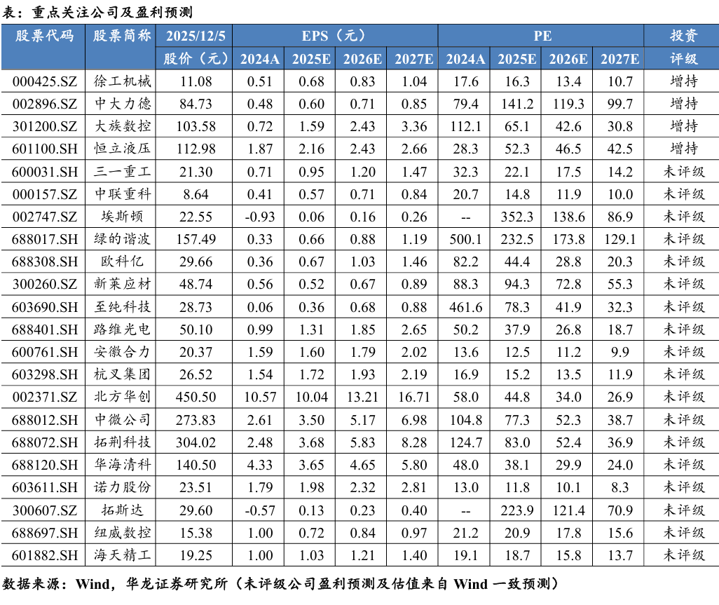 政策强力驱动,全球需求结构性复苏,国产机床高端化进程有望加快。一方面,国内“十五五”规划将工业母机列为需超常规攻关 的重点领域,工信部发文强调布局建设中试平台,一系列政策组 合拳将极大加速国产机床,特别是五轴联动、车铣复合等高端产 品的技术突破与产业化应用。另一方面,日本机床10月订单数据 连续17个月增长,且主要由出口驱动,提示全球高端制造投资复 苏的积极信号。在此背景下,建议重点关注那些在核心部件上具 备自研能力、产品线已覆盖高端领域、并能受益于全球资本开支 回升的龙头企业,如纽威数控(688697.SH)、大族数控 (301200.SZ)、海天精工(601882.SH)等。